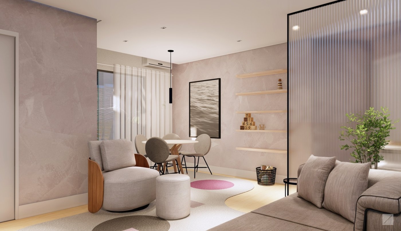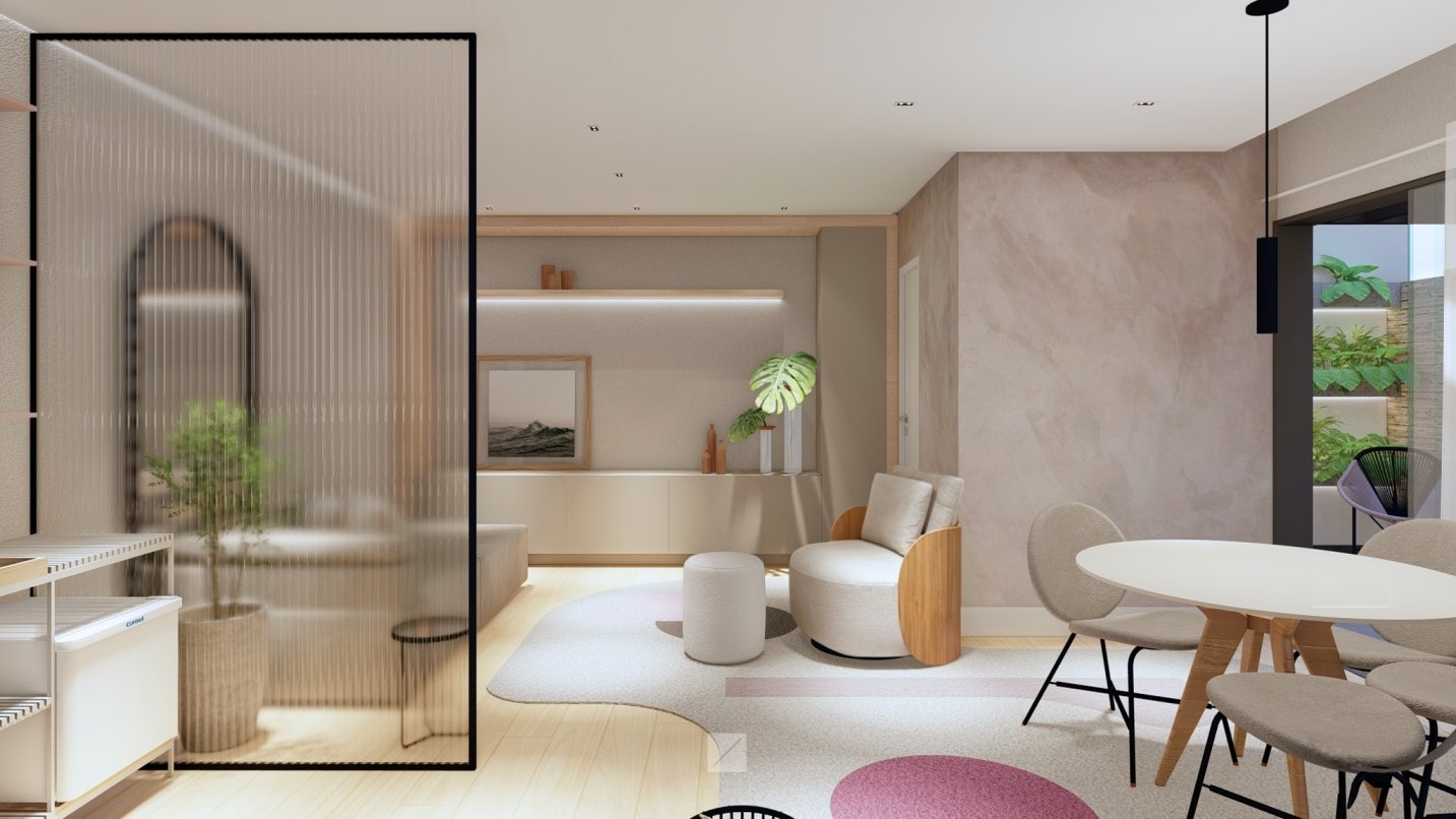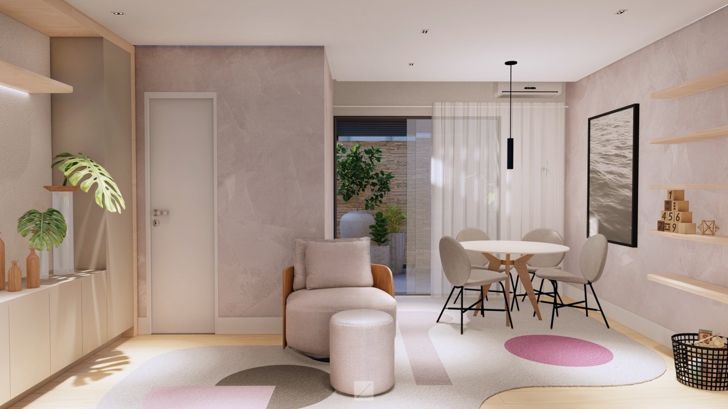 Na elaboração do projeto de interiores deste consultório de psicologia decidimos usar conceitos que remetem a marca da clínica: Leveza, aconchego e cores em tons pastéis de rosa.